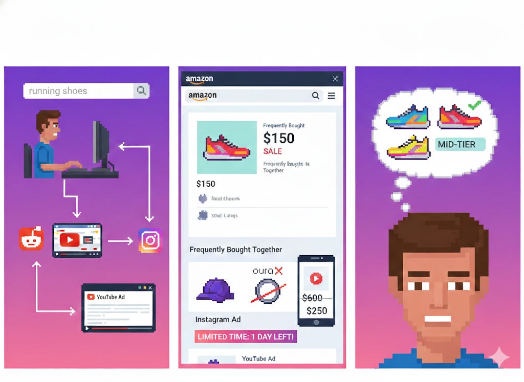 Enough time passes by, and you’re ready to buy a pair online. You either go to your favourite store or browse the Amazon page until you finally pick the running shoes you like. Then you see that you might also want a hat that goes with your run, or even the latest Oura ring, which can track your performance. You find you only have 1 day to buy it during the sale, so you just get the mid-tier version because the $600 price tag was too much.